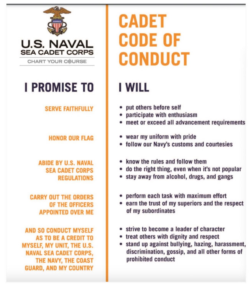 The USNSCC Cadet Code of Conduct is a set of rules and guidelines that all cadets in the United States Naval Sea Cadet Corps (USNSCC) must adhere to. These rules are designed to promote discipline, respect, and responsibility among cadets, and outline the behavior expected of them while participating in USNSCC activities. The code of conduct includes rules regarding personal conduct, respect for others, adherence to orders, and representing the USNSCC in a positive manner. Violations of the code of conduct can result in disciplinary action, up to and including dismissal from the program. It is essential for all cadets to understand and follow the USNSCC Cadet Code of Conduct in order to maintain a safe and respectful environment for all participants.